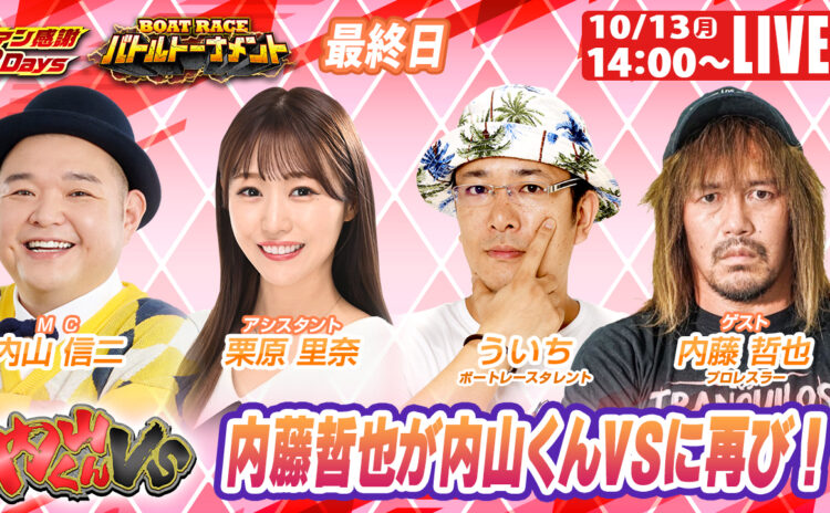 三国の「ファン感謝3Days ボートレースバトルトーナメント」最終日の模様を伝える公式YouTubeは、プロレスラーの内藤哲也さんをゲストに迎え午後2時から配信される。
