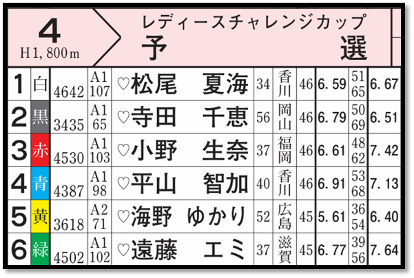 前半の4R(上図参照)は遠藤エミにとって厳しい大外6コースとなりそうだが、小野生奈(3号艇)と平山智加(4号艇)が1着条件(6.83)となっており、いずれかが攻め手になることは必至。十分展開がありそうだ。ここの着順次第で後半9R(2号艇)が得点率トップの座をかけた勝負となることだろう。注目したい。