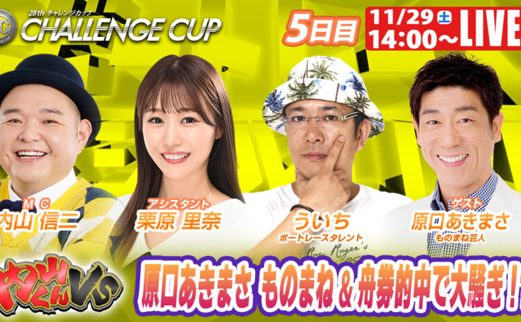 ボートレース福岡の「SG第28回チャレンジカップ&G2第12回レディースチャレンジカップ」の模様を伝える公式YouTube5日目は、ゲストにものまね芸人の原口あきまささんを迎え14時から配信される。