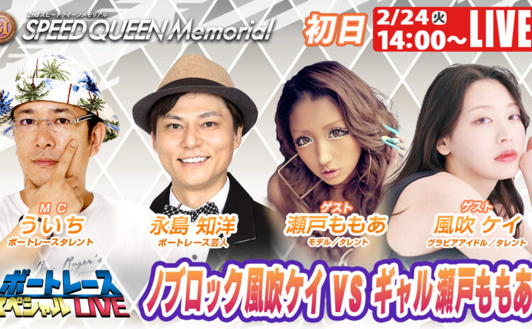 ボートレース鳴門の「プレミアムG1第2回スピードクイーンメモリアル」の模様を伝える公式Youtube初日は、ゲストにモデルでタレントの瀬戸ももあさんとグラビアアイドルでタレントの風吹ケイさんを迎え14時から配信される。