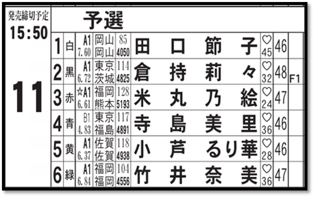 こうした上位に迫る中堅クラスの1人が小芦るり華(佐賀出身・佐賀支部28歳)【写真2枚】。3日目終了時点の得点率を6.25(4走25点)としており、ボーダーを6.00と想定した場合、きょう4日目の2走で11点が必要となる。1号艇の前半6Rを制することができれば、後半11R(下図参照・5号艇)は無事故完走で当確となる公算だ。